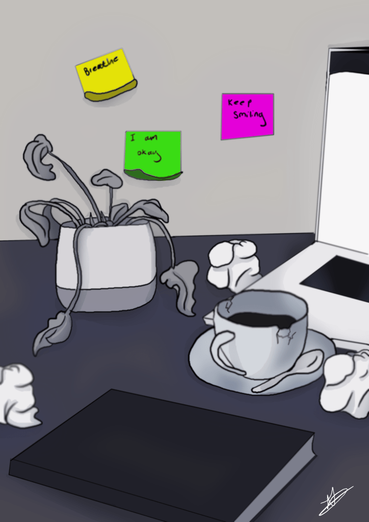 Image description: a monochromatic grey image with a desk, a journal, a cracked coffee cup, an open laptop and a wilted plant surrounded by crumpled pieces of paper. The only colour comes from three bright notes on the wall: a yellow one saying ‘Breathe’ in black, a green one saying ‘I am okay’ in black, and a pink one saying ‘Keep Smiling’.