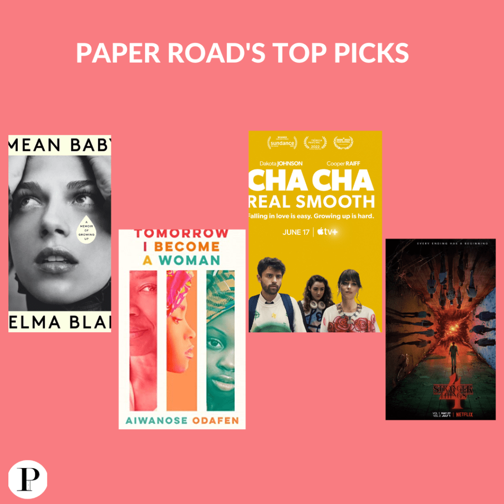 Image description: a pink background has white text saying ‘Paper Road’s Top Picks’. There are four rectangle images in the middle. The first is cream with black text reading ‘Mean Baby’ across the top and ‘Selma Blair’ at the bottom accompanied by a monochrome image of Blair. The second is white with pink, purple, orange and blue text reading ‘Tomorrow I Become a Woman’ across the top, and ‘Aiwanose Odafen’ along the bottom and there are three profiles of women in the centre in pink, orange and blue. The third is a mustard colour with white text reading ‘Cha Cha Real Smooth: Falling in love is easy. Growing up is hard.’ in the top two thirds of the image and the bottom has coloured images of the three main characters. The final image is quite dark, with red being the colour in focus and figures standing around it, almost as if they are walking down a hallway. There is text reading ‘Stranger Things 4’ in black and red near the bottom of the rectangle. In the bottom left corner there is a rounded white logo with a P for Paper Road.