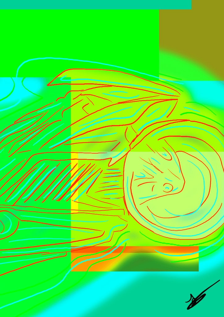 Image description: a red and blue line drawing of a motorcycle with rectangle shaped neon green, yellow, blue, dark green and orange patches decorating the background.