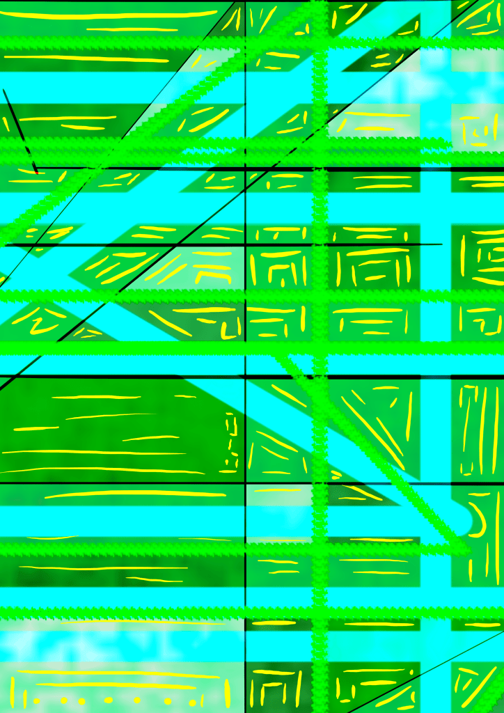 Image description: an intricate design of green rectangles that have thin yellow and black lines, thicker neon blue lines and textured green lines crisscrossing throughout the image.