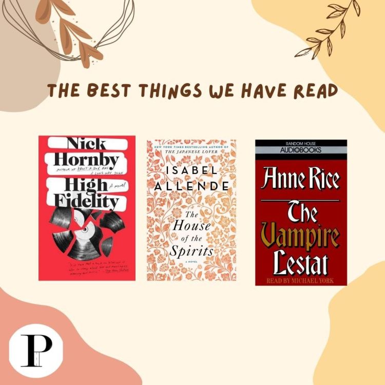 Image description: there is a light pink square with cow print pattern blobs in nude, mid-pink and grey purple and a leaf design in browns is reaching down from the top to frame the brown text reading ‘The best things we have read’. There are three images in the centre: a red one with a broken record and white tape reading ‘Nick Hornby High Fidelity’ in black, a white one with peach floral imagery reading ‘Isabel Allende The House of the Spirits’ in black and a wine-red image reading ‘Anne Rice The Vampire Lestat’ in white, though Vampire is in yellow, and the Paper Road logo of a white circle with a black P is in the bottom left corner of the image.
