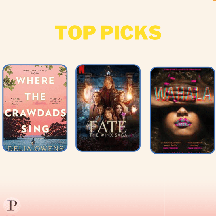Image description: a square poster with a baby pink gradient background that is a darker shade of pink at the bottom and gradually gets lighter as it moves to the top. At the centre of the poster are three rectangle portrait frames rounded at the corners. The frames each contain a poster. Poster one on the left is the pink book cover of Where The Crawdads Sing. Poster two is of the Fate: The Winx Saga season two Netflix poster, featuring four main characters and a dark blue background. Poster three, on the right, is the book cover for the novel Wahala which has a portrait of a woman with purple lipstick who is covering her eyes with her interlaced fingers. At the top of the poster in bold yellow text is the phrase ‘Top Picks’ all capitalised. At the bottom left corner of the post is our logo which is a black capital ‘P’ enclosed in a white transparent circle.
