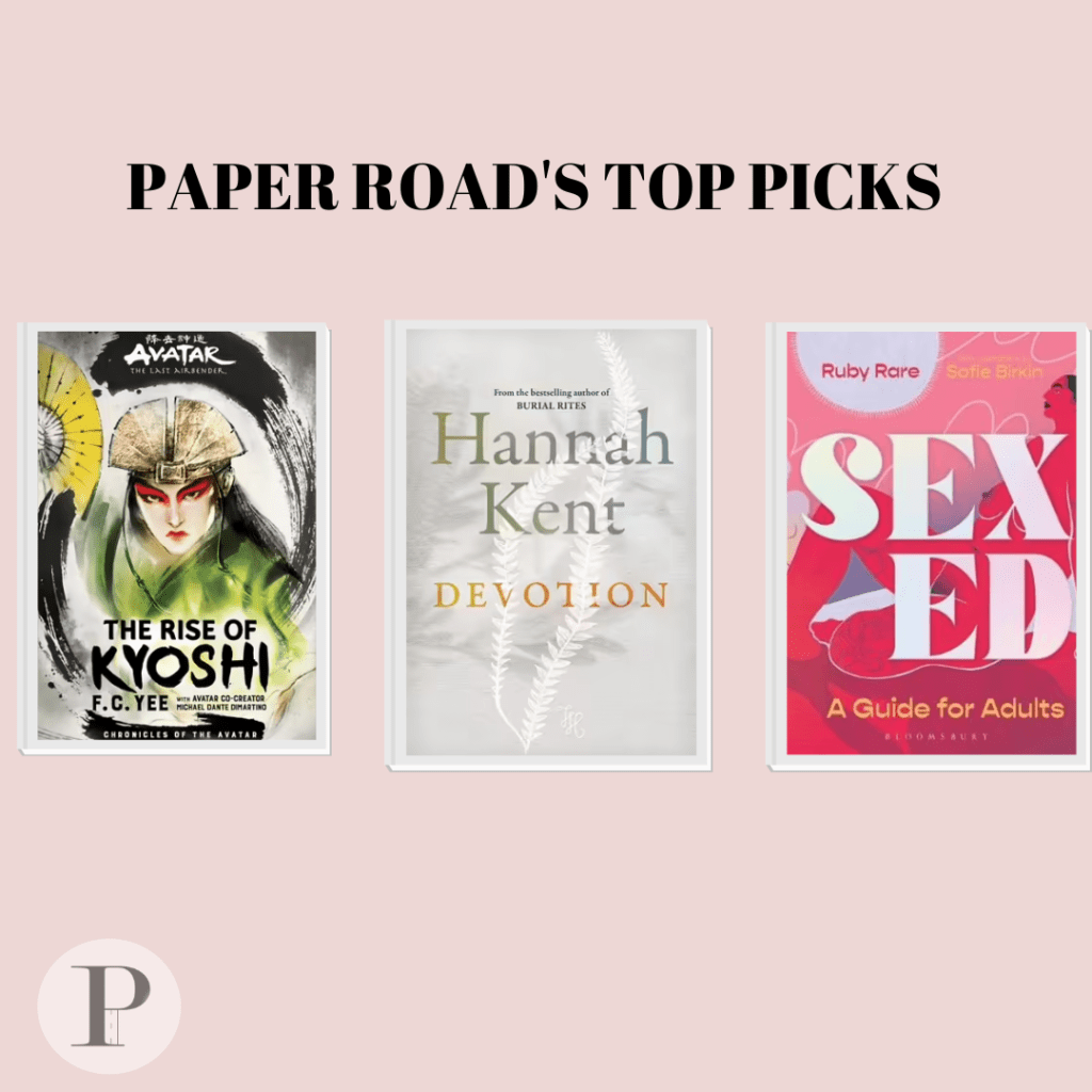 Image description: a light pink background with the Paper Road white logo with black P in the bottom left corner and black text reading ‘Paper Road’s Top Picks’ along the top. There are three rectangular images in the centre: one with a grey background and figure wearing red eye make-up and a green robe surrounded by black ink swirls with black text reading ‘The Rise of Kyoshi F.C. Yee’ at the bottom and ‘Avatar’ in white at the top, one that is grey with darker grey and white floral designs in the lower half and khaki text reading ‘Hannah Kent’ at the top and yellow text reading ‘Devotion’ halfway down the image, and the final one shows a red woman with a pink background and white text reading ‘Sex Ed’ taking up most of the image, red text in the top right corner reading ‘Ruby Rose’ and yellow text at the bottom reading ‘A Guide for Adults’.
