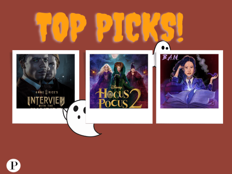 Image description: an ombre red background with bright red script across the top reading ‘Top Picks!’. In the middle of the poster are three polaroid pictures: the first an image of the movie Interview with the Vampire, the second an image of the film Hocus Pocus 2 and finally, the third an image of YouTuber Stephanie Soo. The bottom left-hand corner features the Paper Road logo with a white circle and black P in the middle.