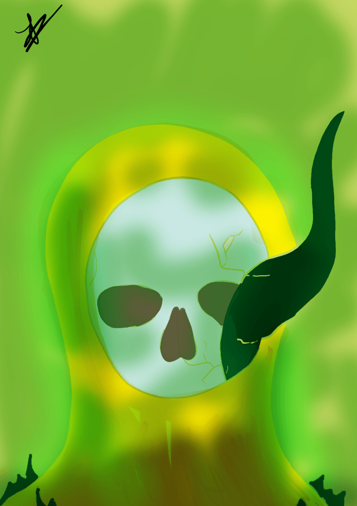 A brilliant streak of green against the black night sky, swollen thunderheads boiling overhead with radioactive spite, their wrath beheld in the howling winds. Few remembered the thermonuclear blast that birthed this maelstrom, fewer still recalled the house and all within that it erased from existence. But Uncle remembered as his hand vacantly wandering up to where his jaw had once been, his mind returned to that horrible night as his fingers brushed the remains of his face.